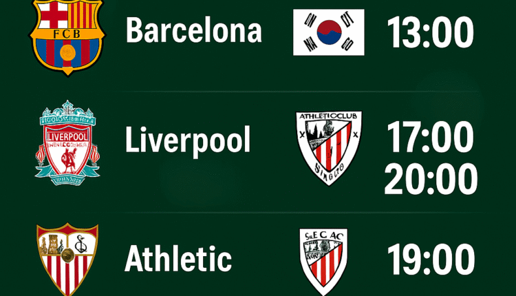 Barcelona in South Korea at 13:00 KST; Liverpool double header at Anfield at 17:00 and 20:00 BST; Sevilla in Riyadh at 19:00 KSA.