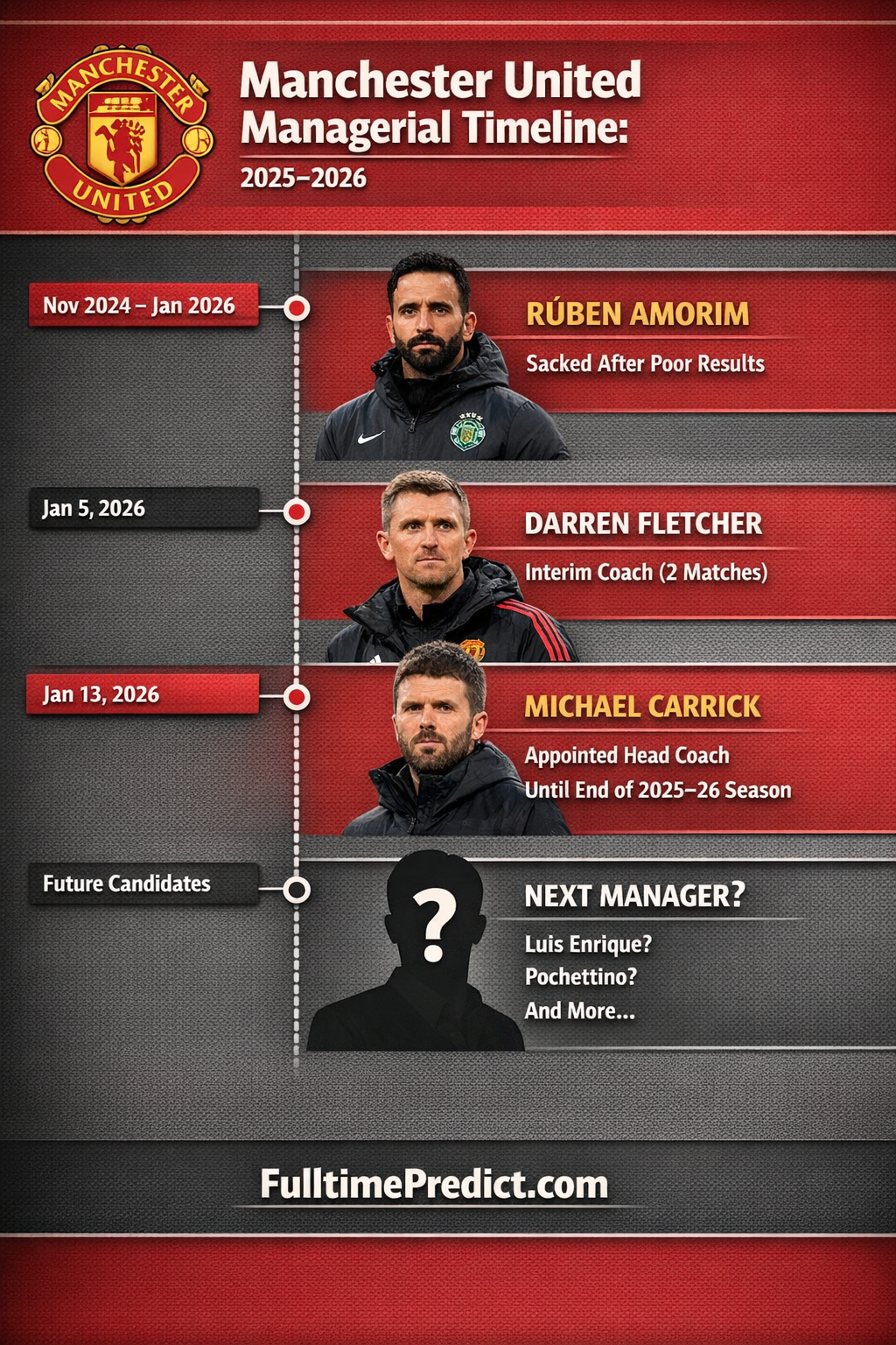 Manchester United are currently navigating one of the most turbulent managerial eras of the modern Old Trafford period. Following the departure of Ruben Amorim in early January 2026, the club hierarchy have opted for a blend of institutional legacy and continuity by appointing Michael Carrick as head coach for the remainder of the season — while strategic plans are underway for a permanent appointment in the summer transfer window.