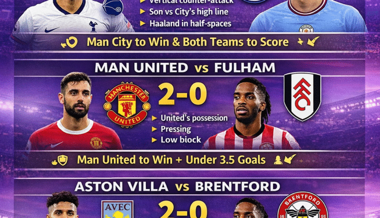 While Saturday sets the tone, Sunday is the decisive day of Matchweek 24. Four high-profile fixtures — Tottenham vs Manchester City, Manchester United vs Fulham, Aston Villa vs Brentford, and Nottingham Forest vs Crystal Palace — will directly impact title race momentum, top-four battles, and relegation survival.