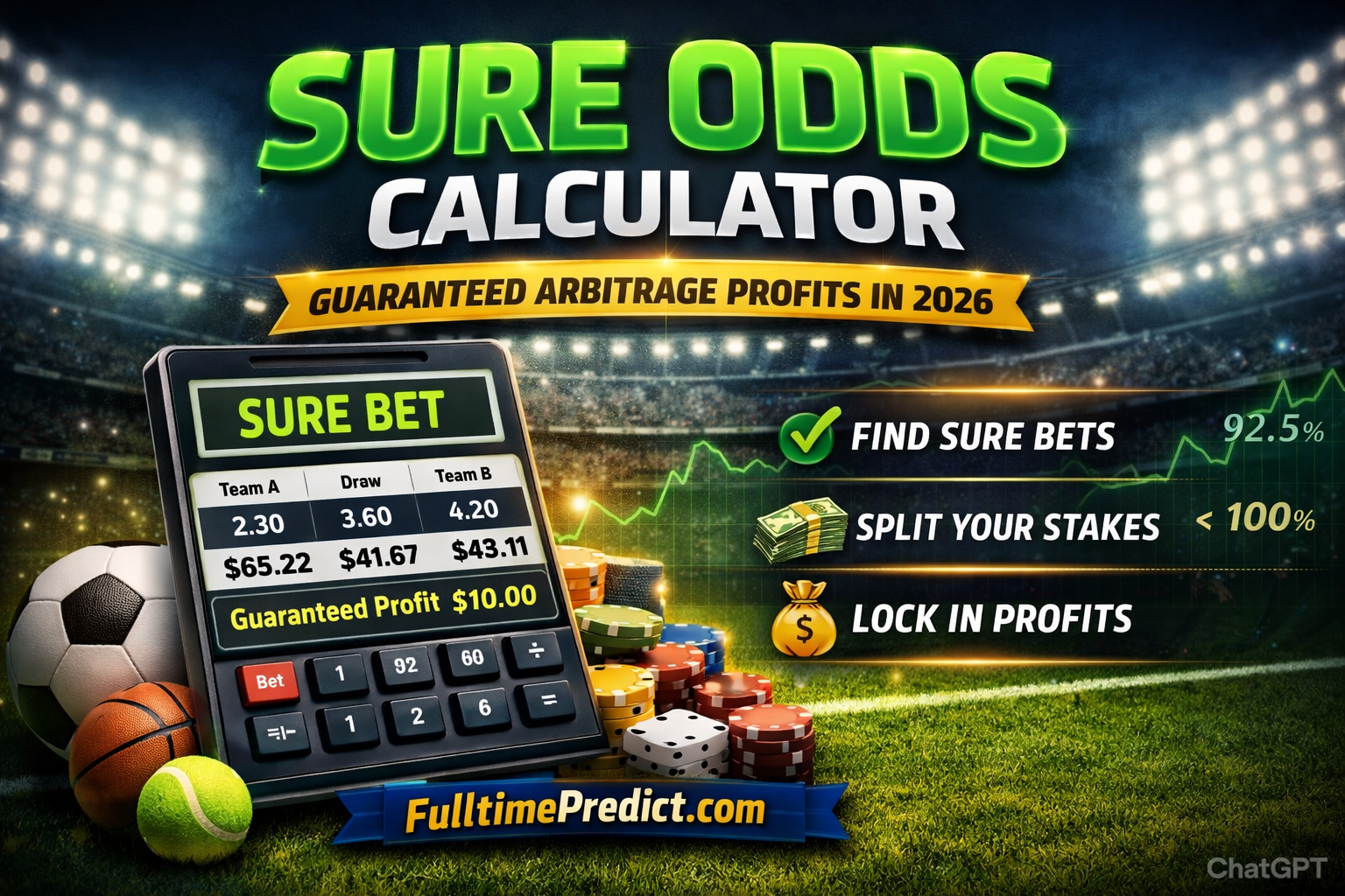 A Sure Odds Calculator is an energetic tool for bettors looking for opportunities to secure profit through arbitrage betting. It shouldn’t be mistaken as a free ticket to wealth, however when used properly and responsibly it can unlock mathematically guaranteed profit opportunities and land you into wealth. And this is something most casual bettors overlook.