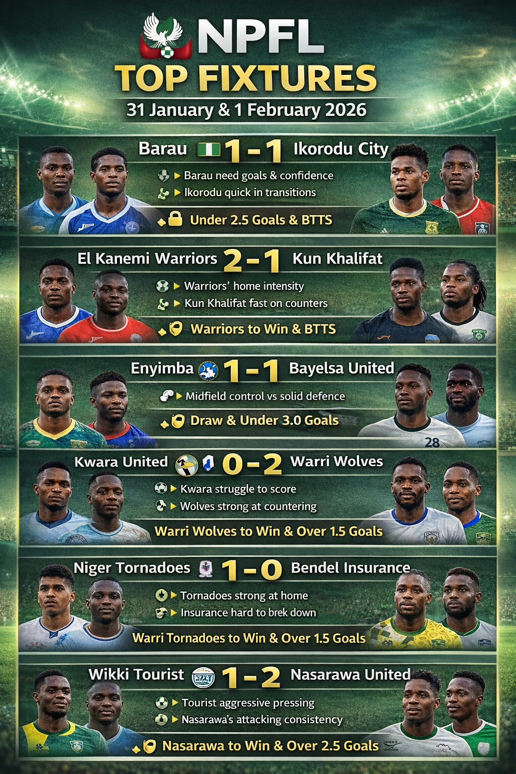 Below is a detailed breakdown of each NPFL fixture for the weekend, including tactical insights, key players to watch, form analysis, and prediction.